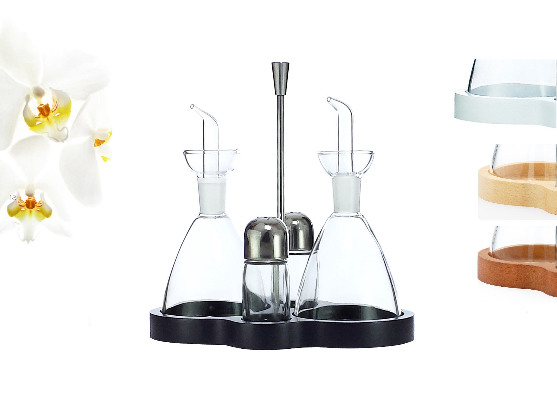 Juegos de Aceiteras para servicio de mesa con la base de madera de haya en distintos acabados, asa de acero inoxidable, compuestos de frasco antigoteo OIL+ de 250 ml y salero/pimentero de cristal con capuchón de acero inox.