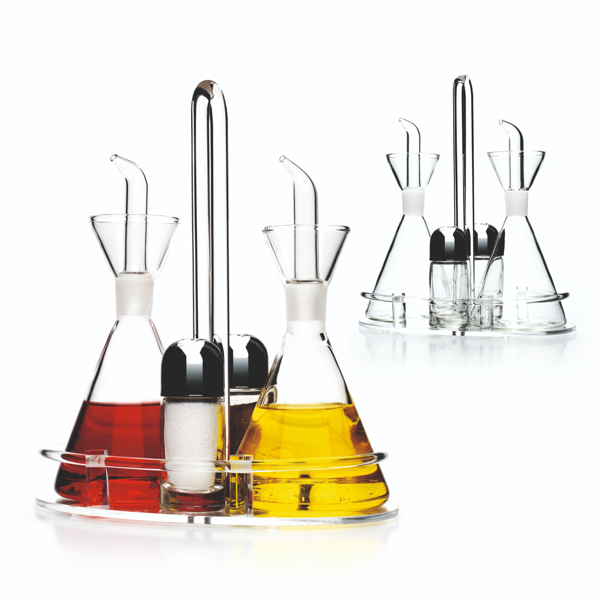 Juegos de Aceiteras para servicio de mesa con la base de Metacrilato compuestos de frasco antigoteo OIL+ de 250 ml y salero/pimentero de cristal con capuchón de acero inox.