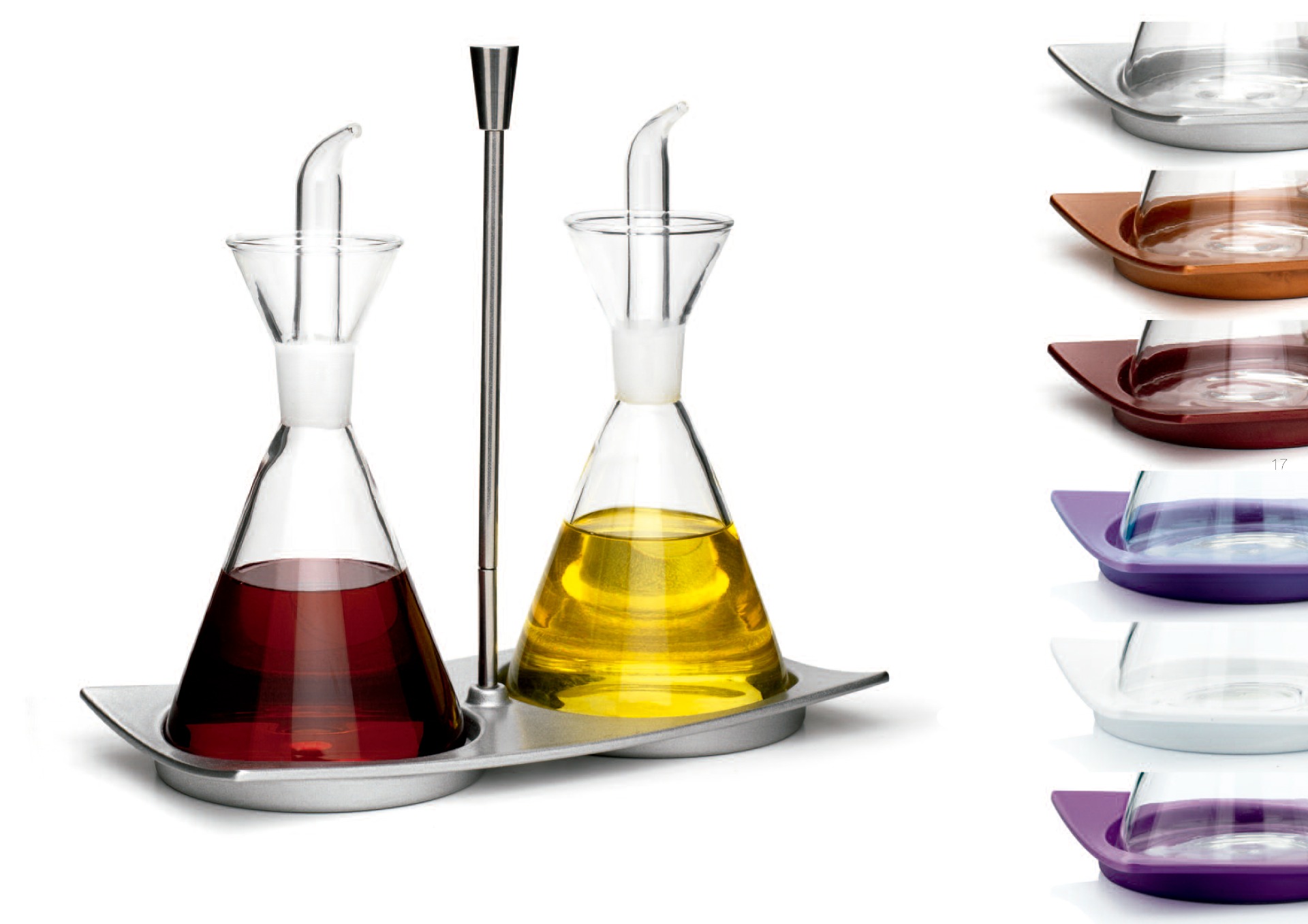 Juegos de Aceiteras para servicio de mesa con la base de resina en distintos acabados, asa de acero inoxidable compuestos de frasco antigoteo OIL+ de 250 ml y salero/pimentero de cristal con capuchón de acero inox.